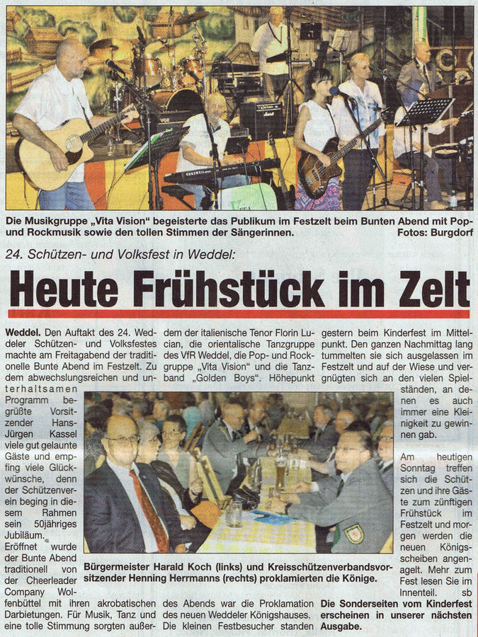 Die Wolfenbütteler Zeitung schreibt über den Auftritt von VitaVision auf dem "Bunten Abend" des Schützen- und Volksfest in Weddel (21.08.2015):